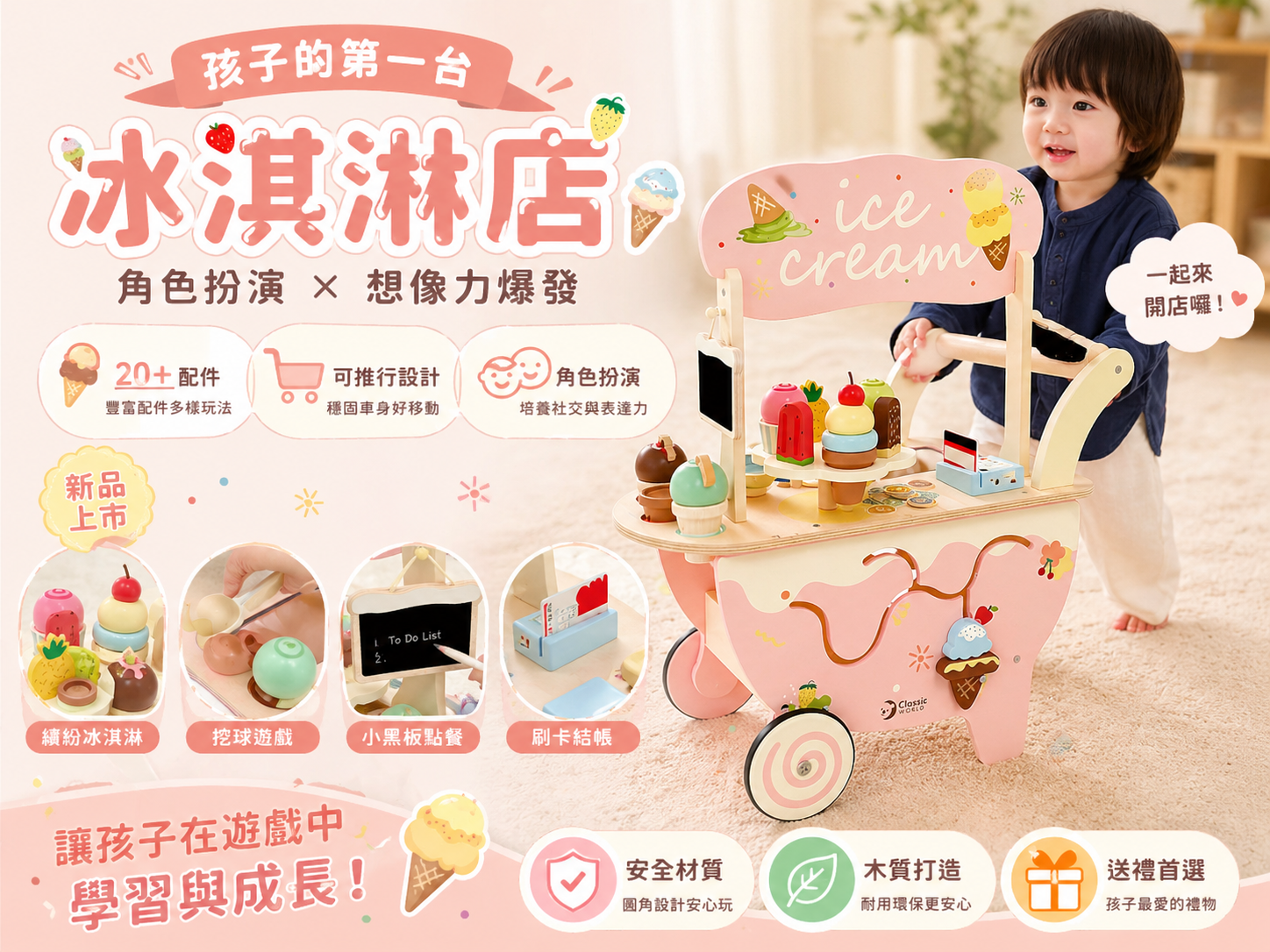 ⭐全配情境攤車:繽紛冰淇淋+各式冰棒+營業工具+小黑板+刷卡收銀機,激發無限想像